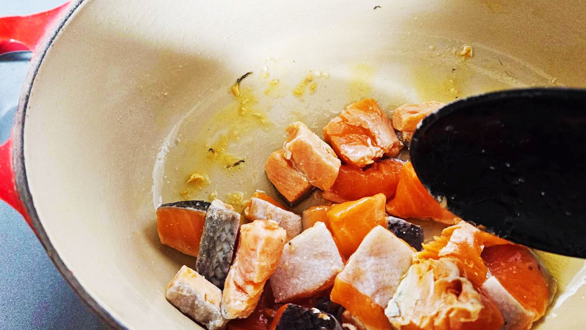 鍋、またはフライパンにオリーブ油をひき、中火で鮭を軽く焼き、いったん取り出す。
