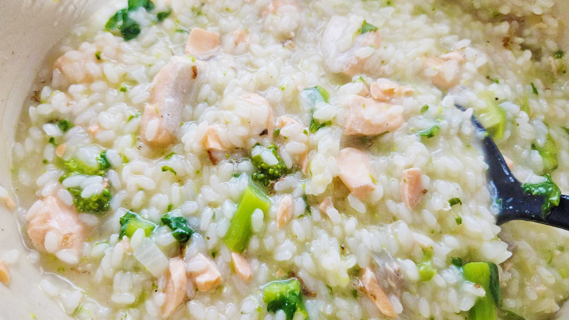 今回は、日々の献立の強い味方となるよう、鮭と菜の花のリゾットを満足感のある一品に仕上げました。食べ応えも十分です!
