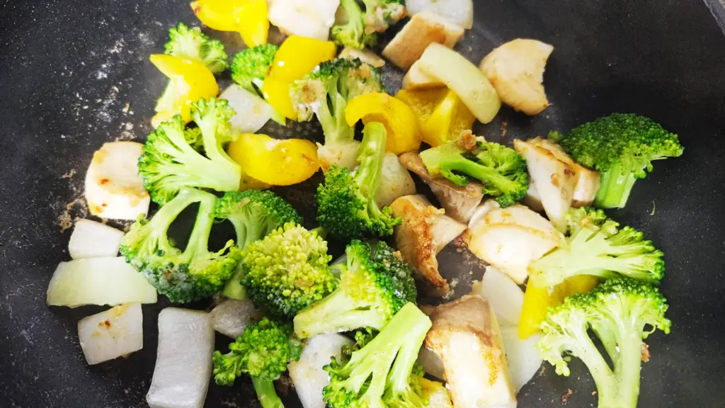 - 同じフライパンに野菜を硬いものから順に加えて炒める。