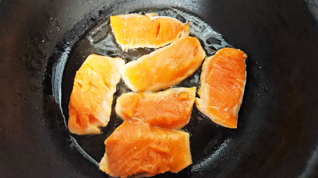 • フライパンにサラダ油を熱し、鮭を皮目から中火で焼く。