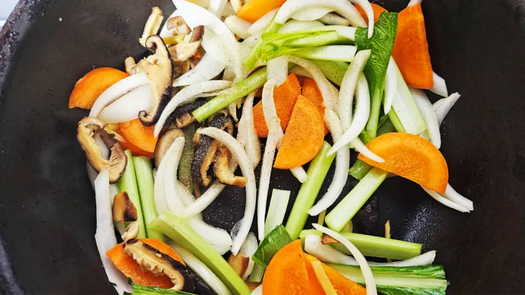 玉ねぎ→人参→小松菜の茎→干し椎茸(千切り)の順に加え、軽く塩コショウして炒める。