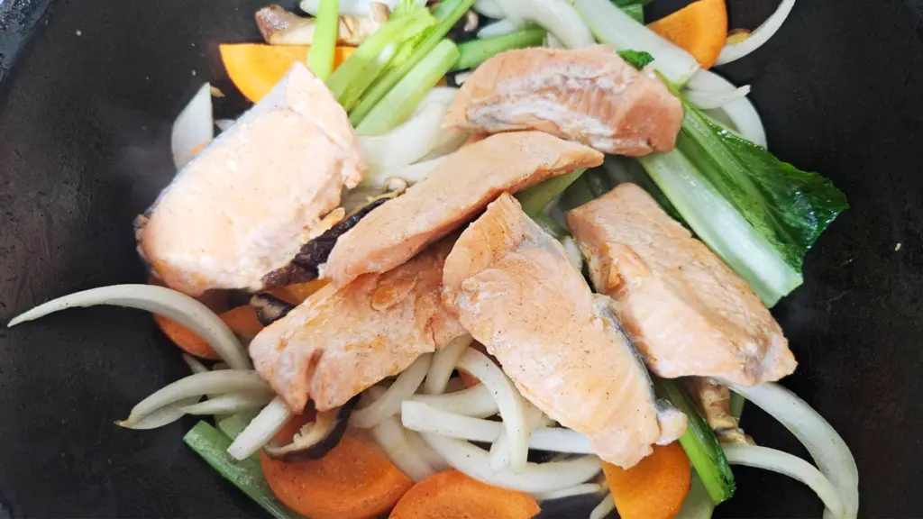 • 鮭の脂を活かして野菜を炒める。不安な時はサラダ油を少し足してOK。