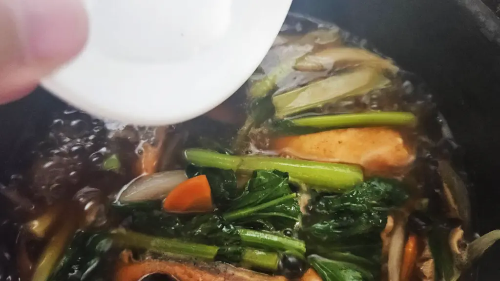 残り2分前に小松菜の葉を加え、ひとまぜしてさらに煮る。
