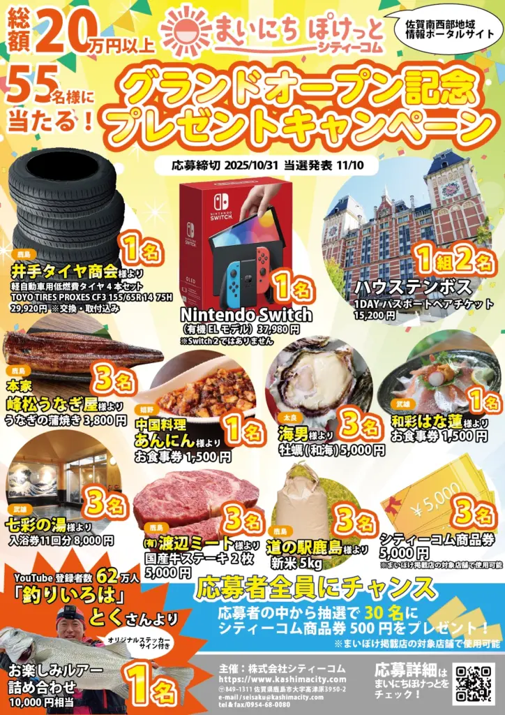 今回、まいにちぽけっとグランドオープン記念としてプレゼントキャンペーンを開催することとなりました!ハウステンボスのペアチケットやNintendo Switchなど様々な商品が当たるチャンスです!
