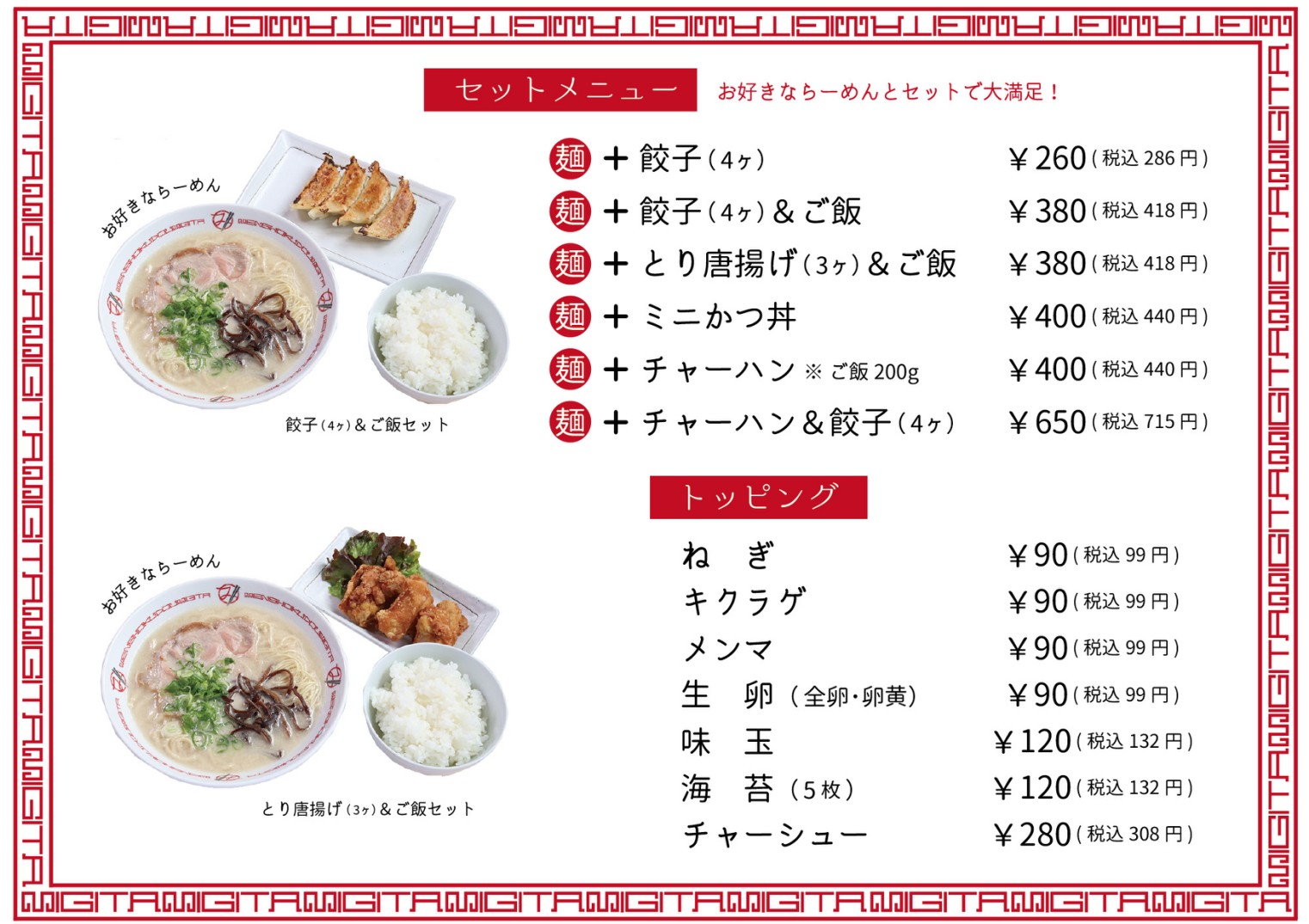| お好きならーめん+とり唐揚げ(3ヶ)&ご飯 | らーめん+418円(税込) |
