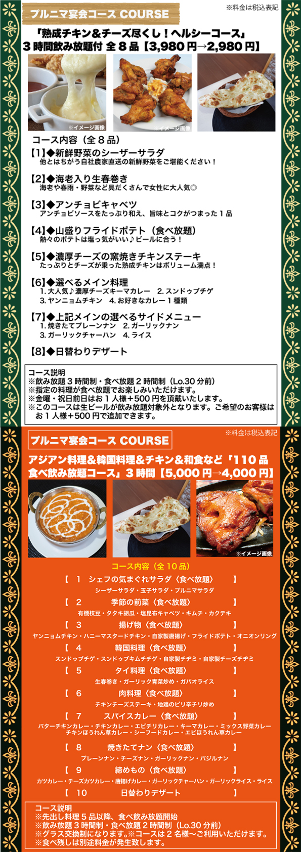 | プルニマ宴会コース (熟成チキン&チーズづくし!) | 3,980円 |
