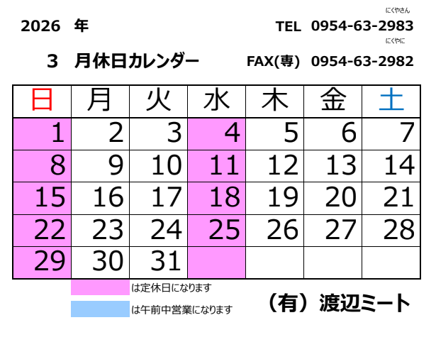 2026年3月のお休みはこちら