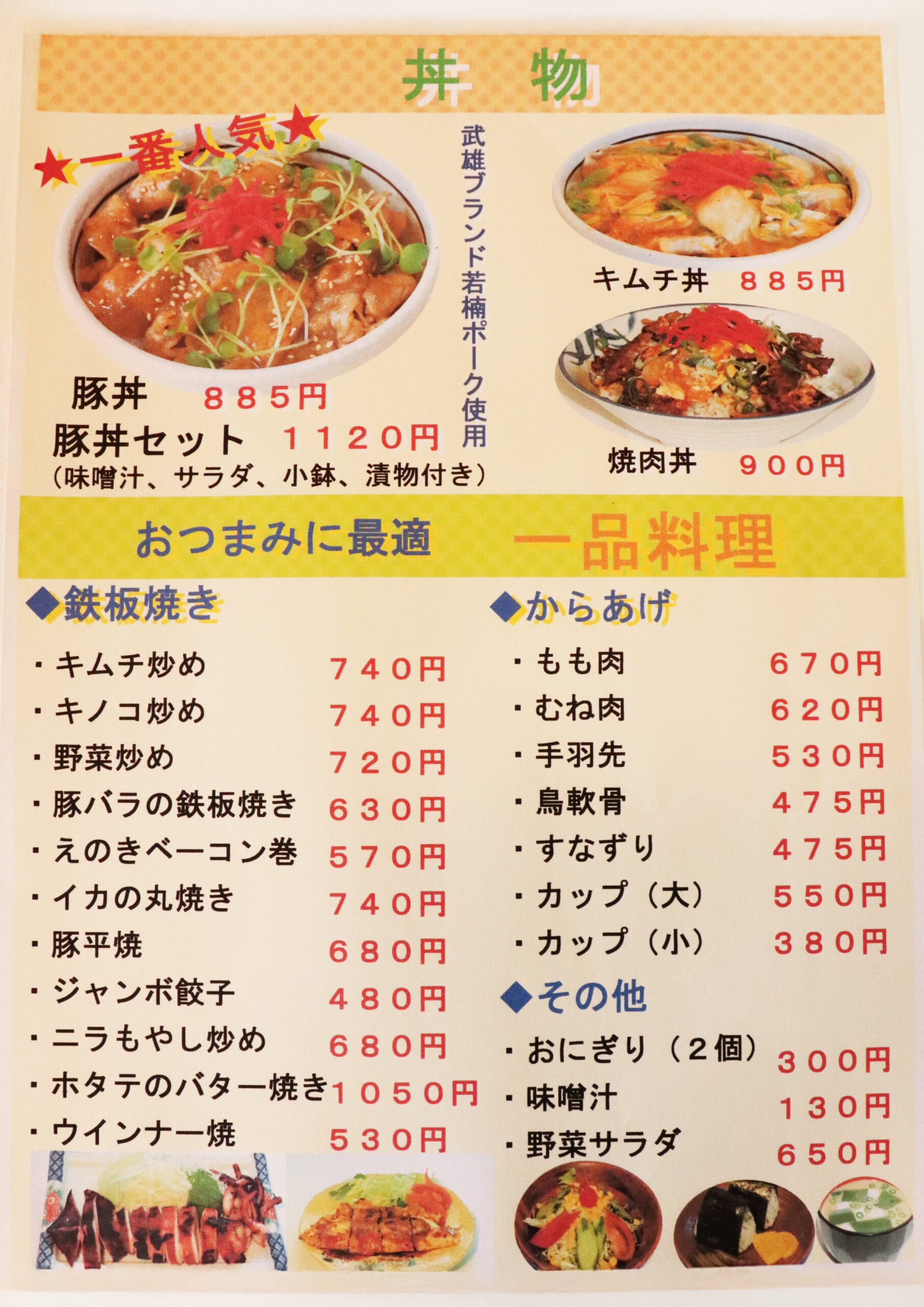 | 豚丼セット (味噌汁 / サラダ / 小鉢 / 漬物) | 1,120円 |